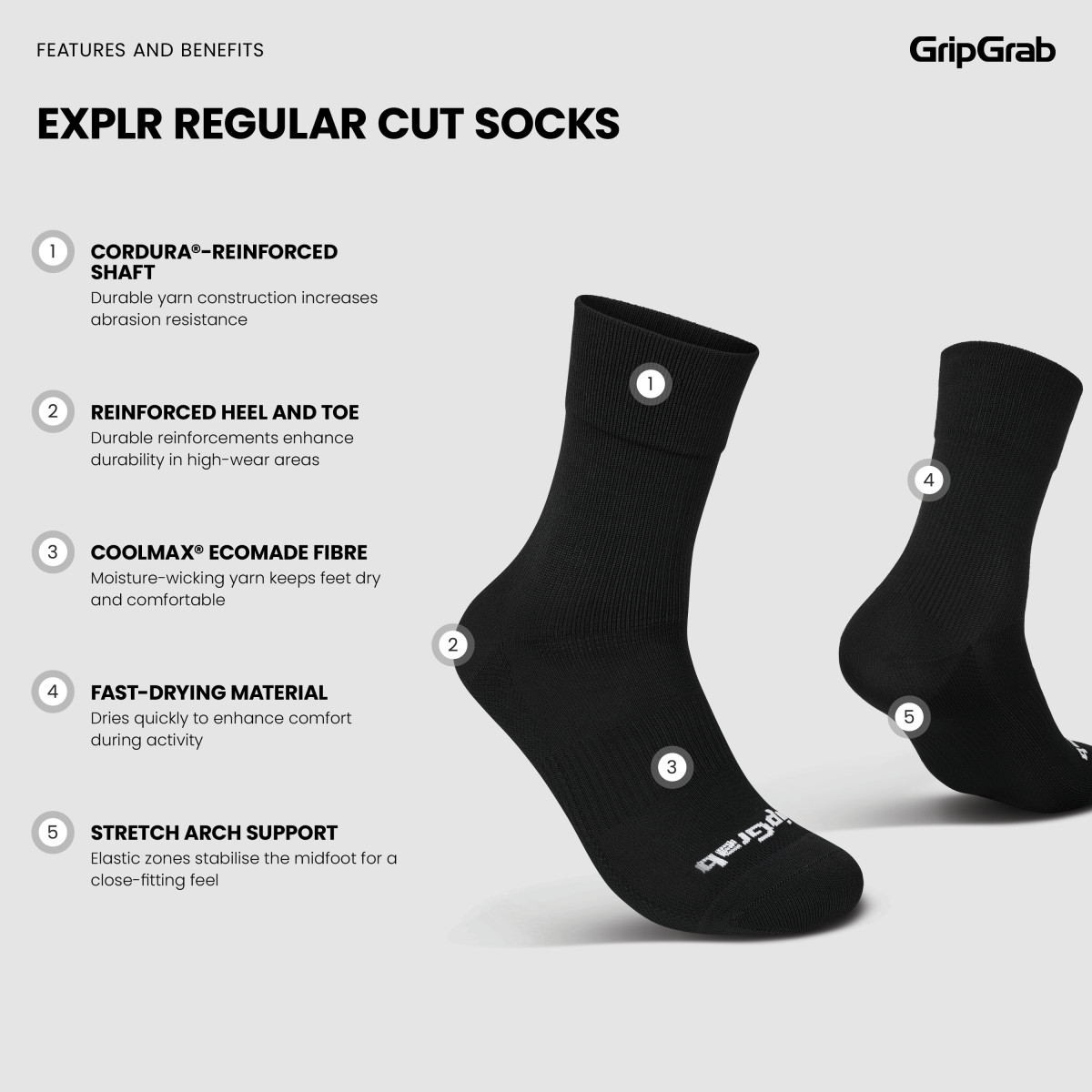 GripGrab EXPLR High Cut socks are designed for long days on gravel roads, forest trails and bikepacking adventures where reliability and comfort are essential. These gravel and MTB cycling socks are built for demanding conditions – abrasion-resistant, moisture-managing and designed to maintain a secure fit throughout the entire ride. The medium-height cuff (15 cm, size M) provides additional protection, while the construction focuses on durability and comfort whether riding in the saddle or walking technical sections.
