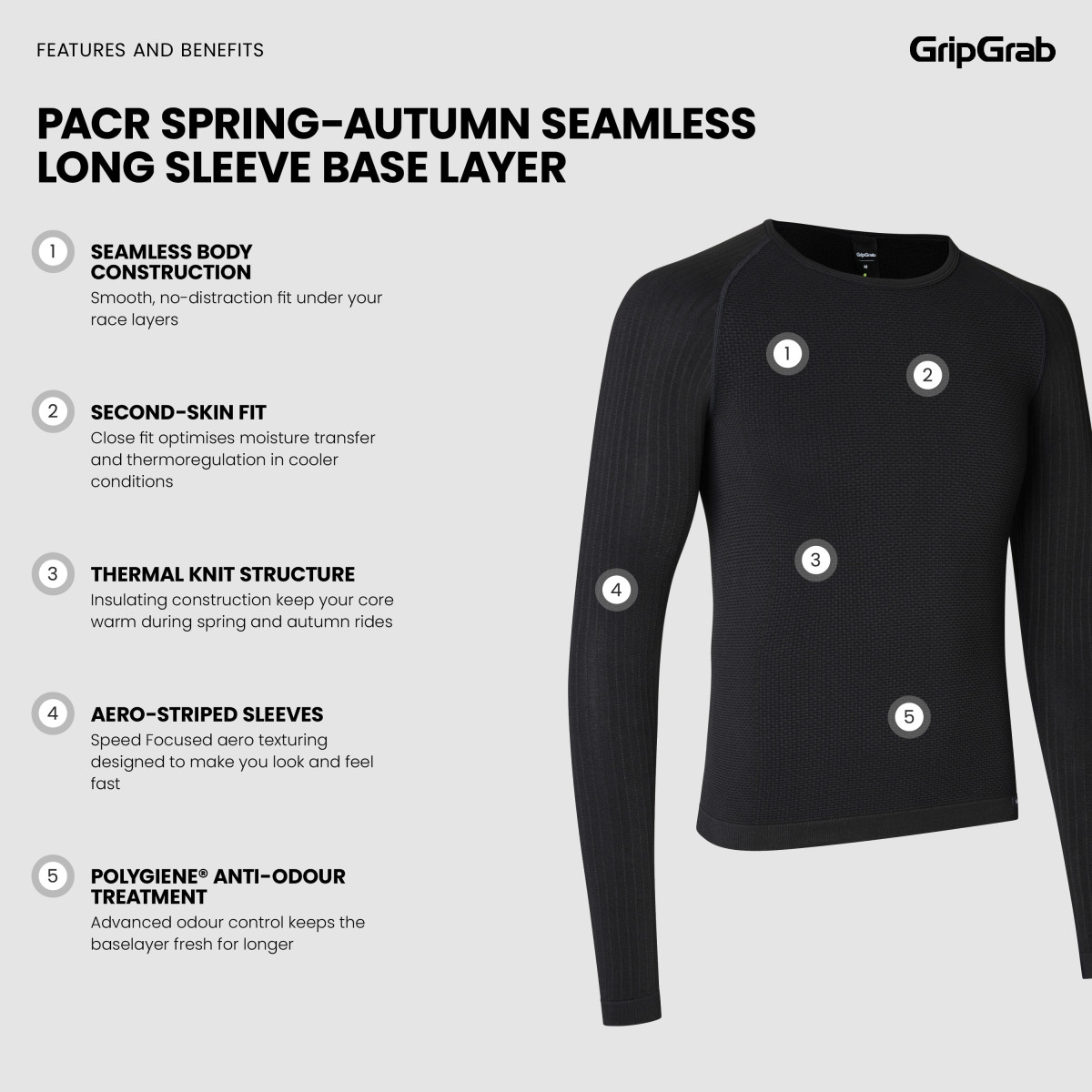 GripGrab PACR Spring-Autumn Seamless Long Sleeve apatiniai marškinėliai sukurti intensyviam važiavimui vėsesnėmis pavasario ir rudens dienomis. Šis techninis apatinis sluoksnis užtikrina efektyvią termoreguliaciją ir drėgmės valdymą, todėl padeda išlaikyti komfortą važiuojant dideliu tempu. Prigludusi konstrukcija skirta dėvėti po aptemptais dviračių marškinėliais, o lengvas ir funkcionalus audinys leidžia palaikyti optimalų mikroklimatą tarp kūno ir viršutinio sluoksnio.